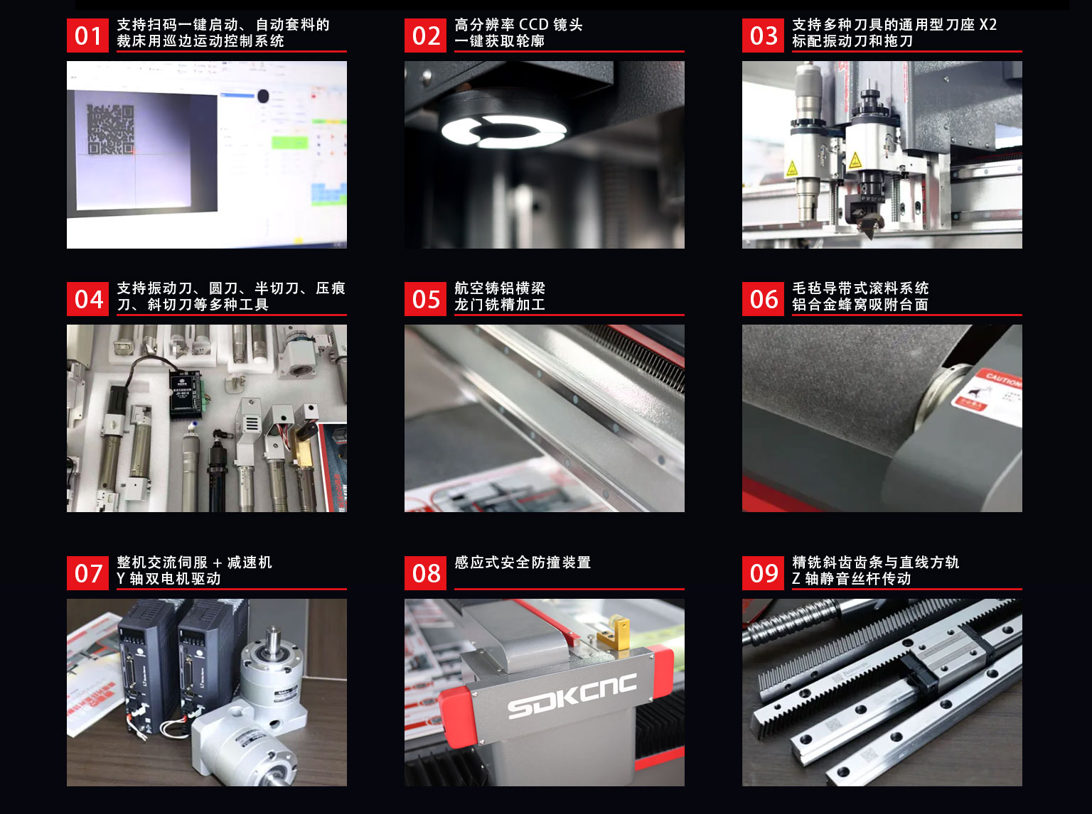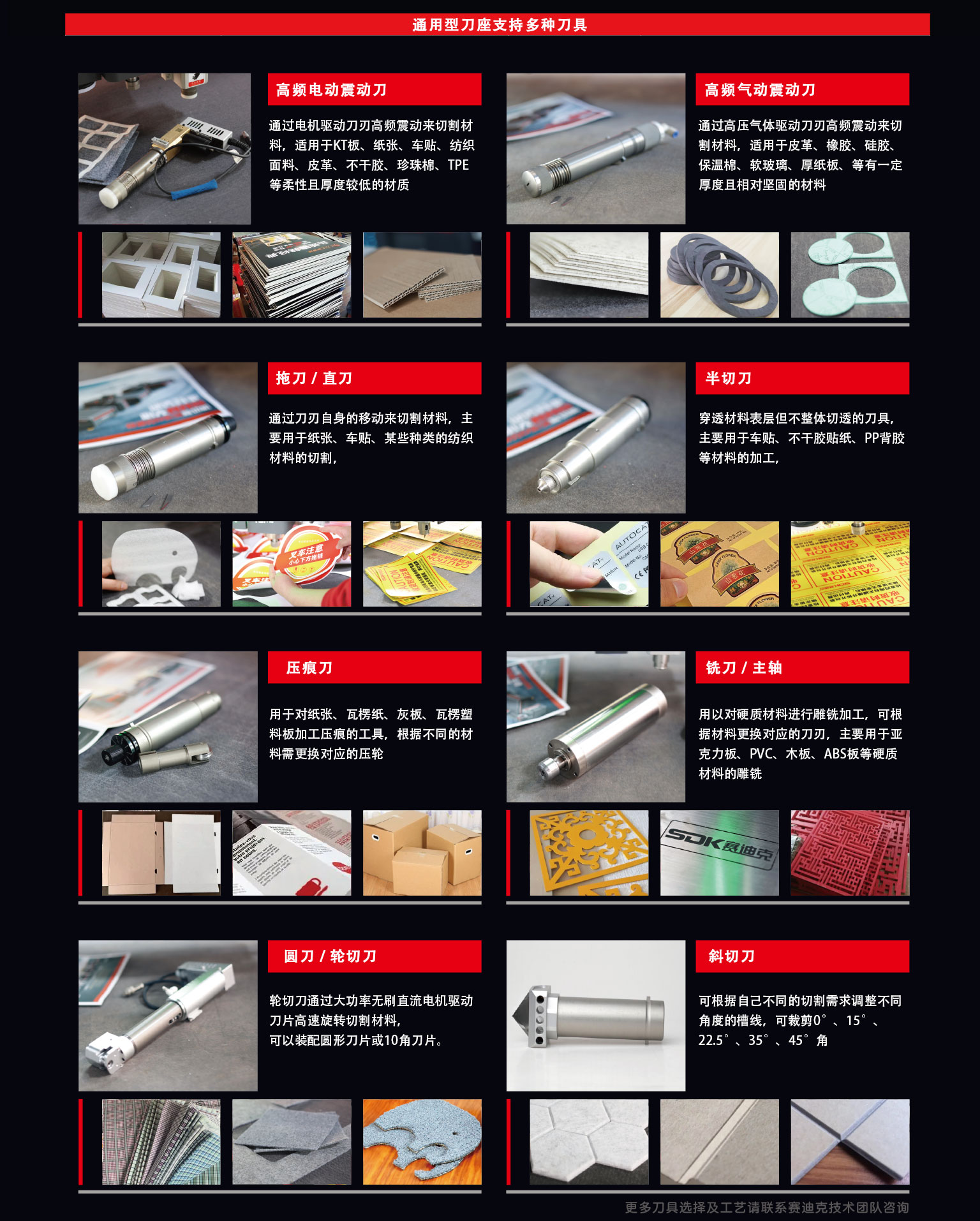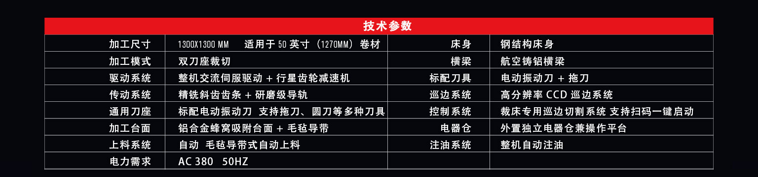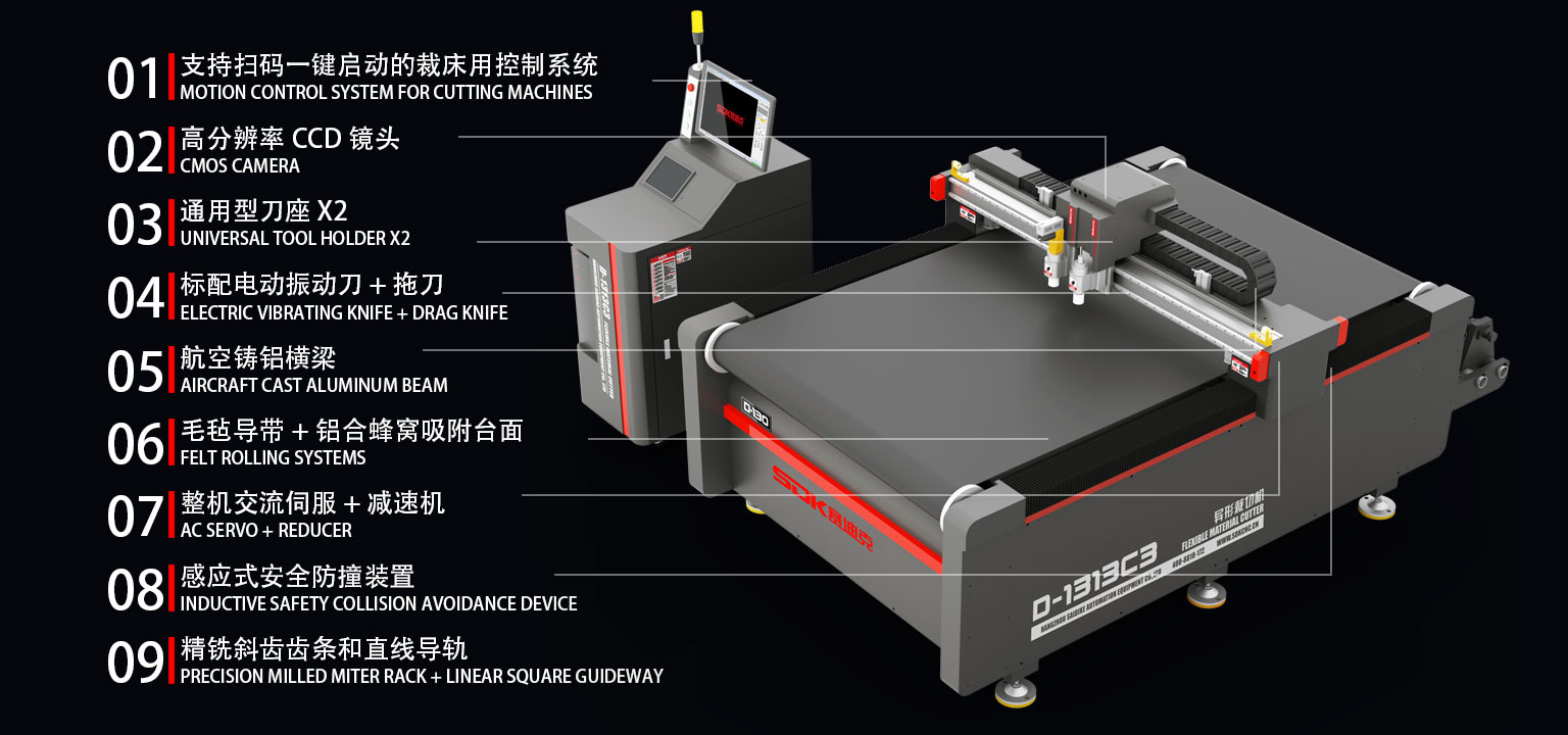D-1313C3是一款对应柔性卷材的高速异形裁切设备,采用导带式加工平台适合超长材料的连续切割。双刀座,标配电动振动刀和拖刀,通用型的刀座支持圆刀、写切刀、压痕刀等多种刀具。支持扫码一键启动的裁床用巡边控制系统,可高速完成柔性材料的裁切、半切、压痕,开槽,冲孔,轮廓识别裁切等多项工艺。